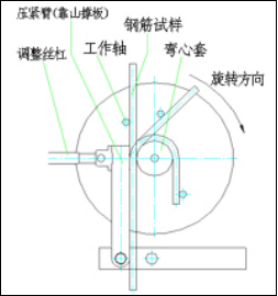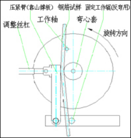 自动正弯试验:按附图3所示将工作轴和弯心套装在工作盘上,按“点动反弯”按键将工作盘反转至起始位置,放入钢筋试验,由压紧装置将试样压紧,再按“点动正弯”按键使正弯工作轴靠近并接触试样后,按“自动正弯”按键,试验机便自动做正向(顺时针)弯曲,并不断显示当前弯曲角度,当弯曲到设定角度时,