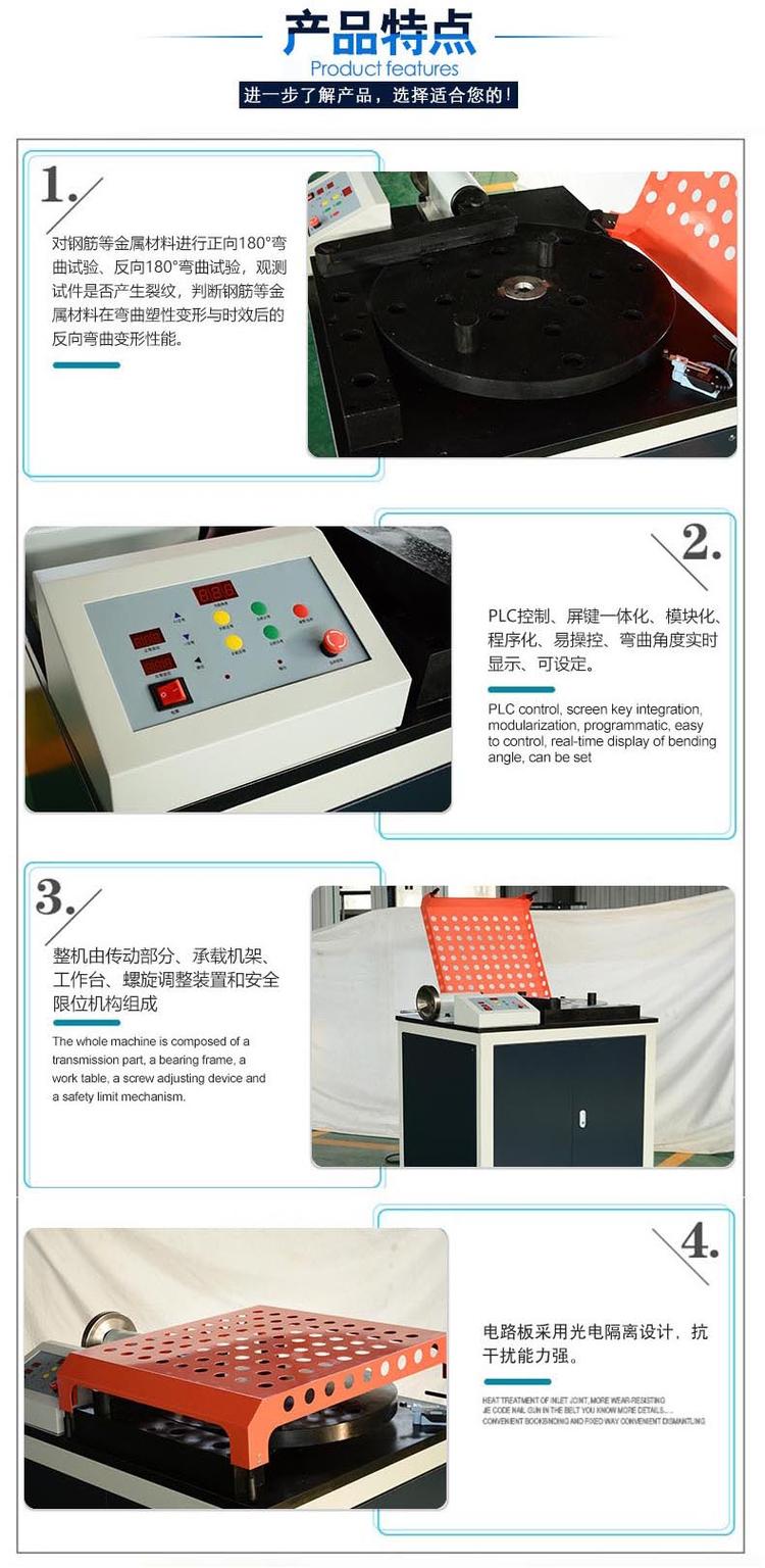 试验机有机架、工作台、工作盘、减速机、压紧装置、电气控制箱、安全防护罩和弯曲附件等构成,具有结构紧凑、操作简单、承载能力大、运行平稳、噪音低,且弯曲角度显示直观、安全可靠、维修方便等特点。为了保证操作人员和设备的安全,试验机还配备了可靠的限位机构,当电气控制部分发生失控或操作时可及时是设备停止运转。