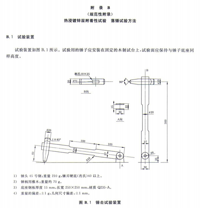 适用于热浸镀锌层附着力试验,是有关生产厂家和质检部门进行产品质量检测和控制所必须的设备。锤头表面应光滑、平整、无毛刺。锤头与锤柄结合应牢固;底座与锤柄之间颖活动灵活。外形尺寸锤头、锤柄及底座公称尺寸及允许偏差见图和表所示锤头、锤柄及底座公称